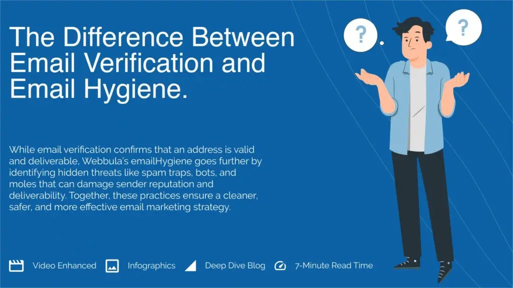 Webbula’s email hygiene goes beyond standard email verification by incorporating a multi-method approach to not only verify but also clean and enhance email lists. Using an email validation service is crucial to improve email hygiene, reduce bounce rates, avoid spam traps, and enhance sender reputation. This comprehensive process involves analyzing email databases to identify and eliminate threats that can harm sender reputation and delivery rates. Webbula’s email hygiene services are designed to provide a deeper level of cleansing, ensuring that your email list is free from harmful elements like spam traps, moles, and bots, which are not typically addressed by standard email verification.